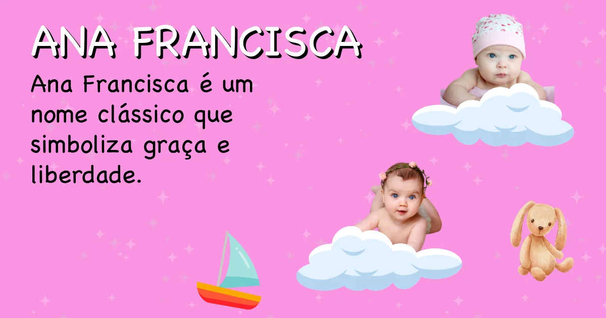 Historicamente, o nome Ana Francisca tem sido popular em países de língua portuguesa, especialmente no Brasil, onde muitos pais escolhem nomes que têm um significado profundo e uma conexão cultural. A combinação é vista como clássica e atemporal, evocando tanto a tradição quanto a modernidade.