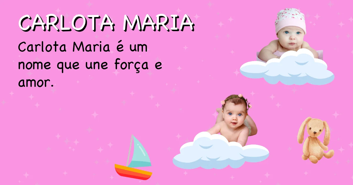 A combinação do nome 'Carlota Maria' tem raízes profundas na história e na etimologia. O nome 'Carlota' é uma variante feminina de 'Carlos', que vem do germânico 'Karl', significando 'homem livre' ou 'forte'. O nome 'Carlos' foi popularizado na Europa através de várias figuras históricas, incluindo reis e imperadores, o que conferiu um certo prestígio ao nome.