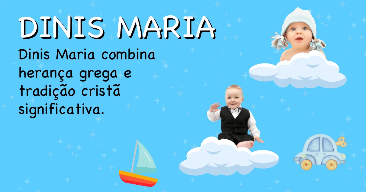 Quando combinados, Dinis Maria pode ser visto como um nome que une a herança cultural e religiosa, refletindo tanto a tradição cristã quanto a influência da mitologia grega. Historicamente, nomes compostos como este eram frequentemente usados para honrar santos ou figuras religiosas, conferindo ao portador uma identidade rica em significado e simbolismo.
